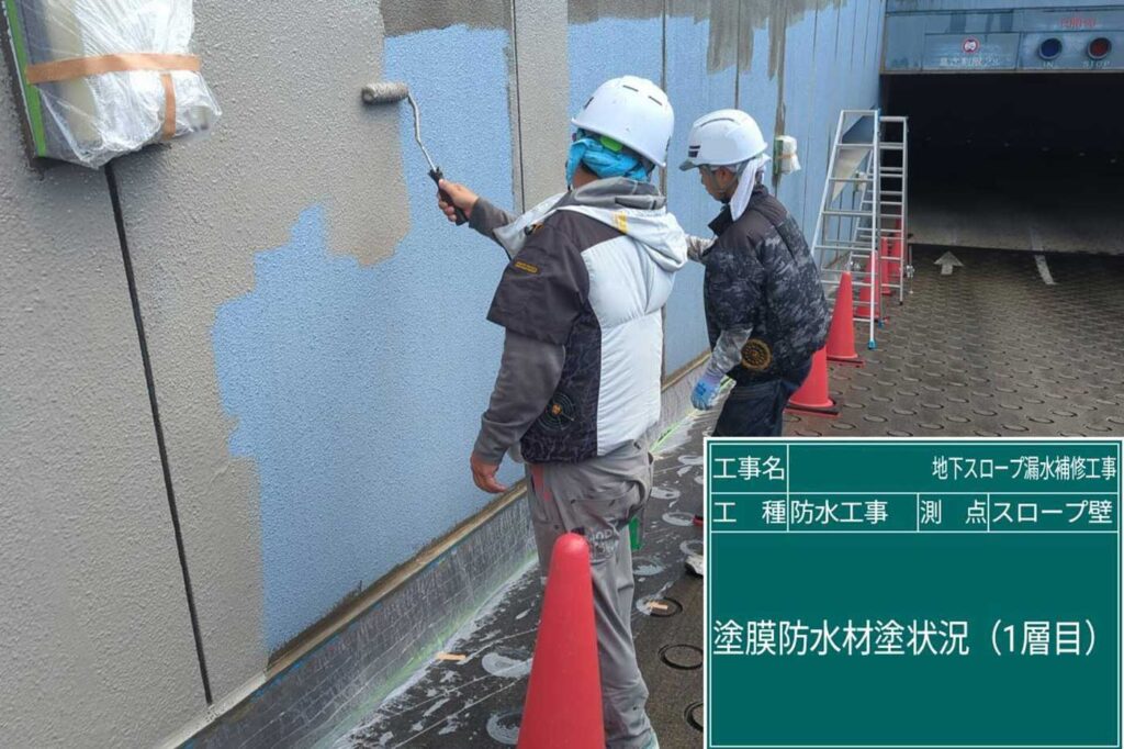 漏水の原因を探すために散水試験を実施して漏水箇所を把握します。この現場の場合は、スロープの壁のひび割れが原因と推察されましたのでひび割れに対して樹脂の注入を行い、更に壁に塗膜防水処理を実施しました。